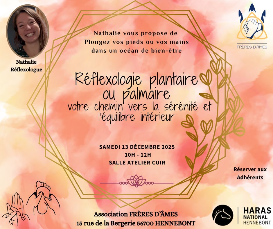 Prenez un moment pour vous détendre et découvrir les bienfaits de la réflexologie lors d’un atelier individuel animé le samedi 13 décembre 2025, de 10h à 12h pour une durée de 30mn, au Haras National d’Hennebont – Salle Cuir. 🌿